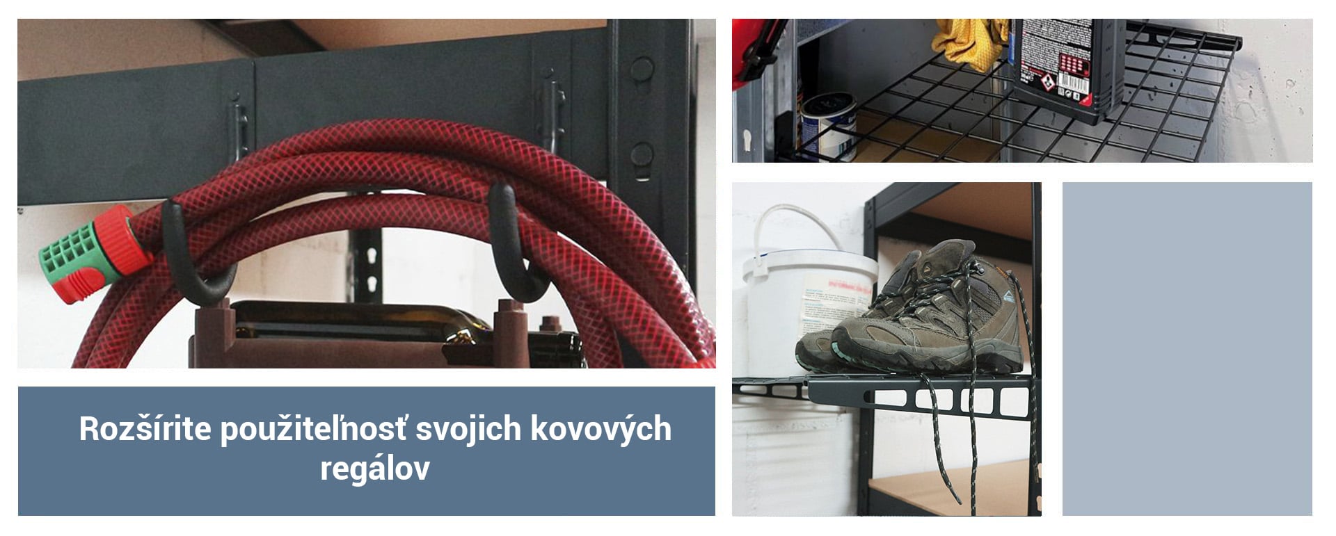 Kvalitného výrobcu regálov poznáte podľa toho, že k svojim výrobkom ponúka široké spektrum príslušenstva. Vďaka tomu nie ste nútení vyrábať kovové háčiky, police alebo koše a rôzne ich pripevňovať na Vaše kovové regály Rivet. Či už si vyberiete drôtený kôš, drôtenú policu alebo kovové háčiky k regálu Rivet, vďaka dômyselnej konštrukcii regálov háčiky a police zacvaknete do predpripravených otvorov alebo uložíte drôtený kôš priamo na police. Bez vŕtania alebo skrutkovania. S našim príslušenstvom k regálom Rivet môžete rozšíriť využiteľnosť svojich kovových regálov na maximum.