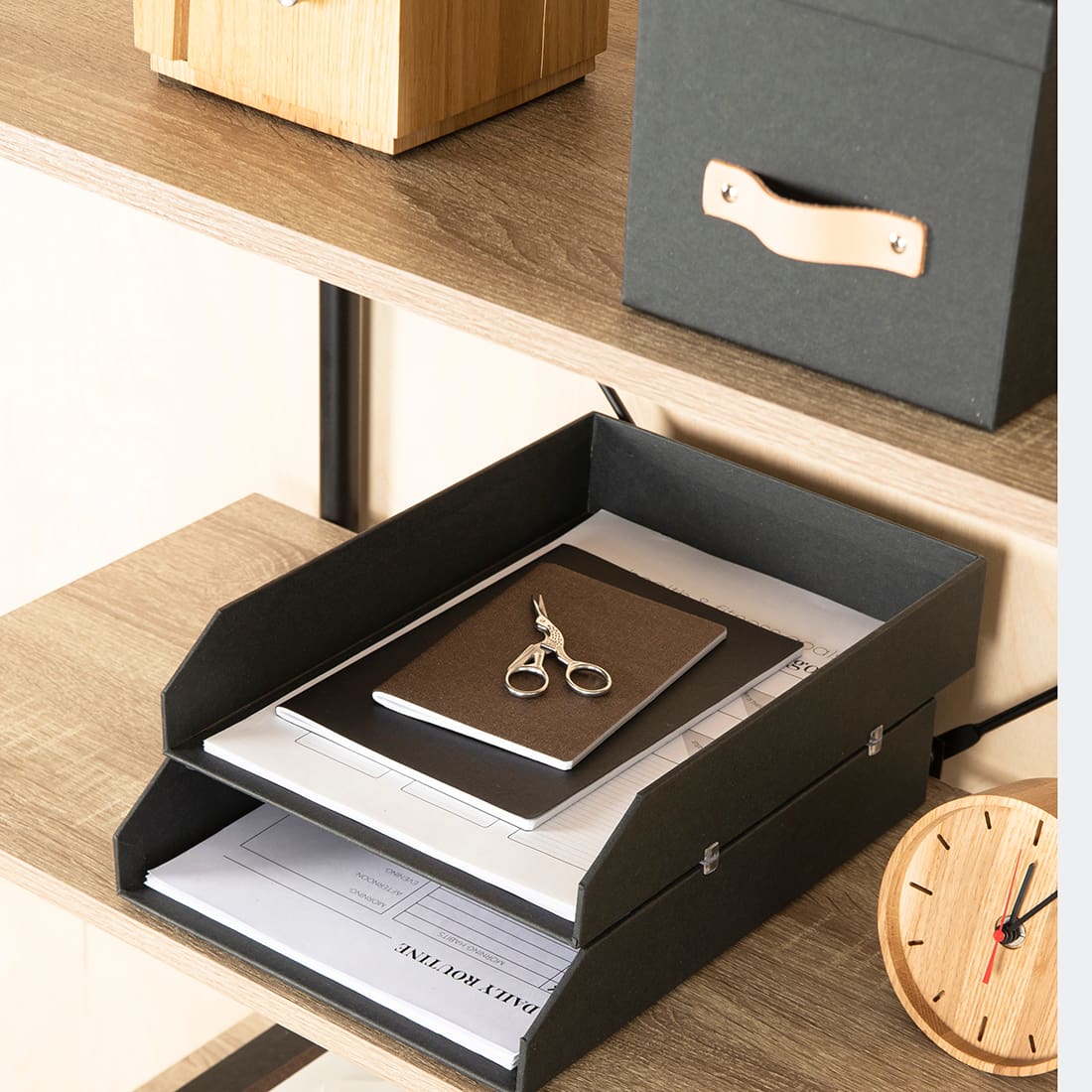HAKKAN – estetický stolový organizér na dokumenty v sivej farbe je výborným doplnkom k otvoreným policovým regálom. Je vyrobený so 100% recyklovateľného papiera, bez použitia chlóru, a preto vyniká v kombinácii s regálmi s drevenými policami DECO. Znižuje dopad na životné prostredie - opätovným použitím toho, čo už bolo použité, šetríme naše lesy a prírodu!
