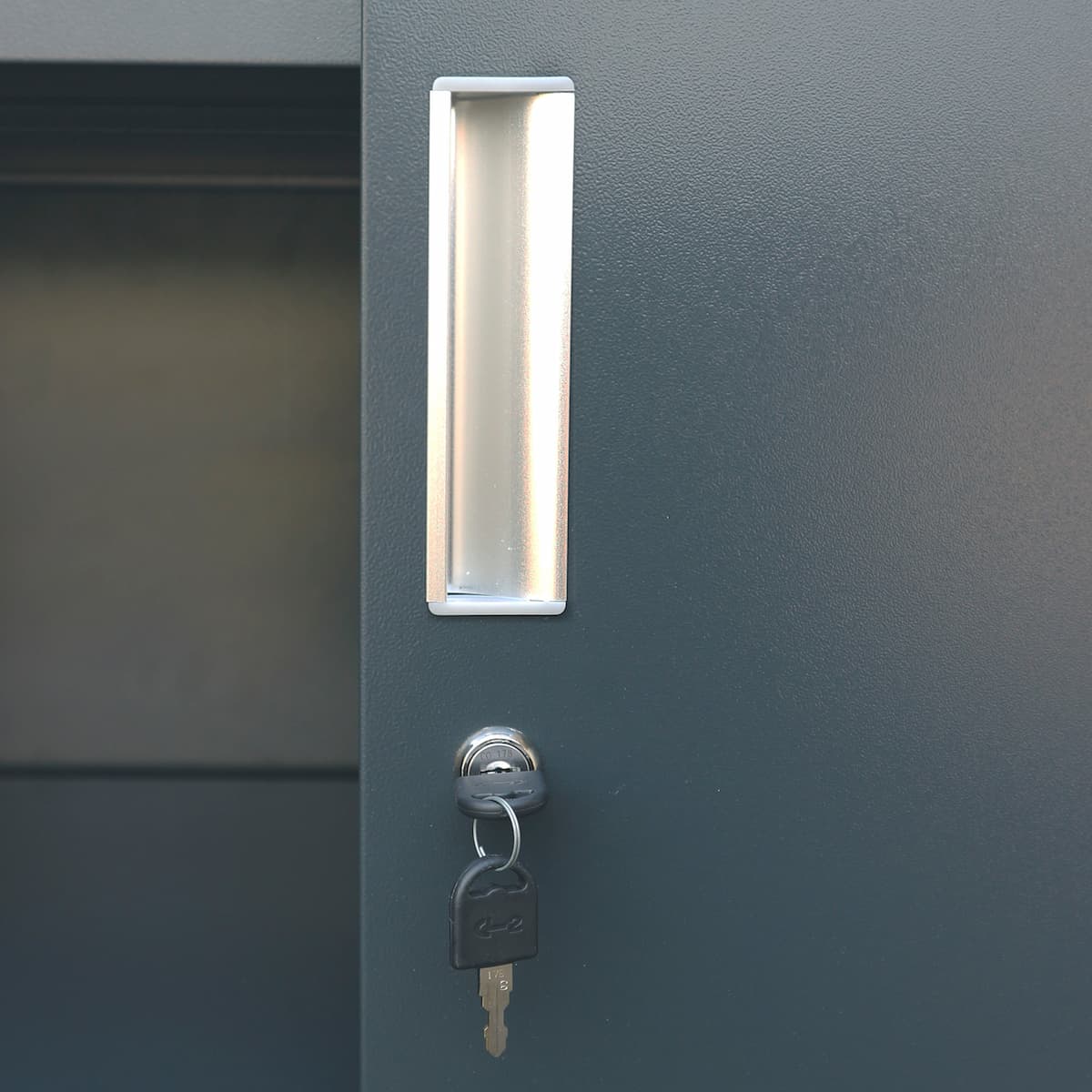 Robustná vysoká oceľová skriňa so štruktúrovaným povrchom a otváracími dverami s madlami je ideálnou skriňou do garáže, dielne alebo pivnice.